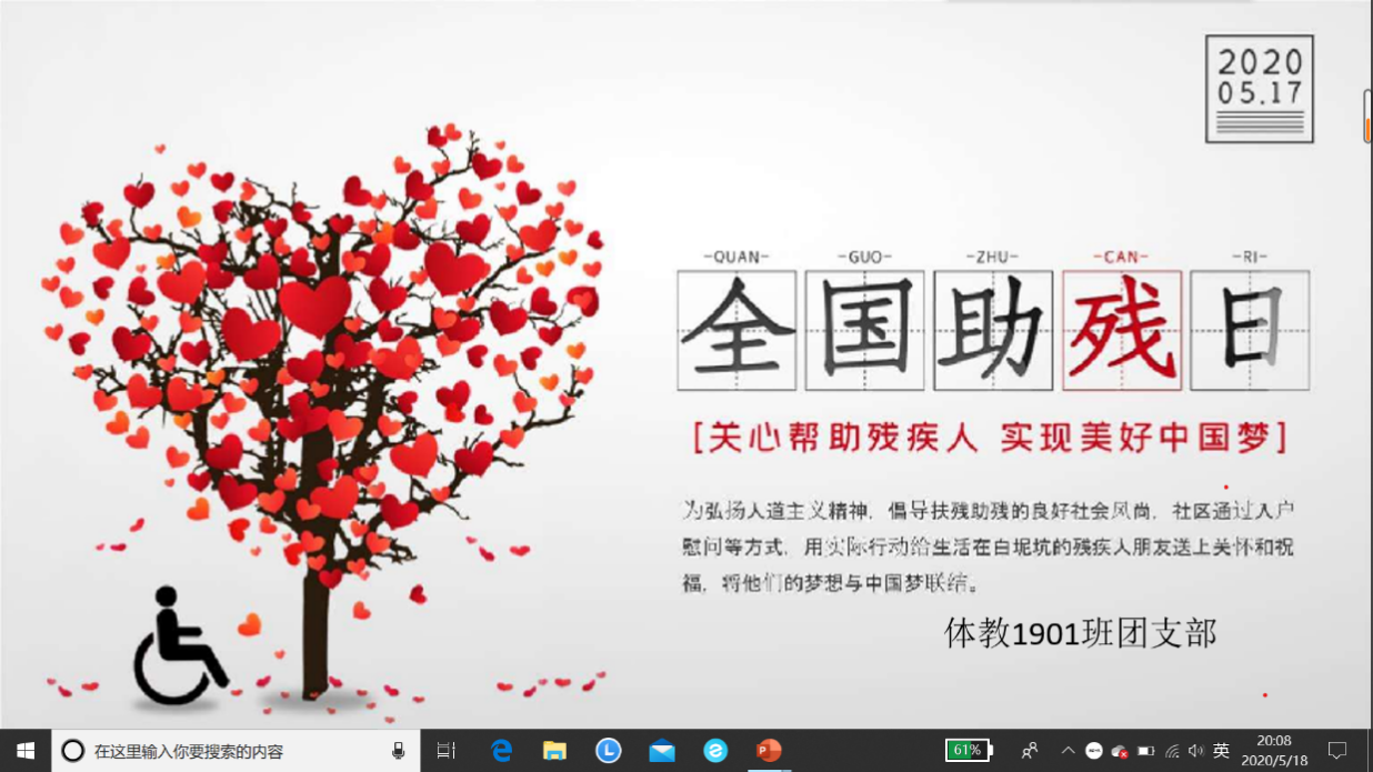 为进一步加强我院学生对残疾人教育事业的了解和思考,鼓励同学们积极投身到帮助特殊人群的志愿服务活动中,营造争当友爱有为的新时代先锋的良好氛围,5月18日晚上19:00,开云kaiyun体育1901班团支部通过腾讯会议顺利开展了以“传承特师博爱精神,争做残疾人事业的后浪”为主题的团日活动。开云kaiyun体育直属党支部副书记吴月华、辅导员努尔老师以及开云kaiyun体育1901班全体同学参加了本次活动。