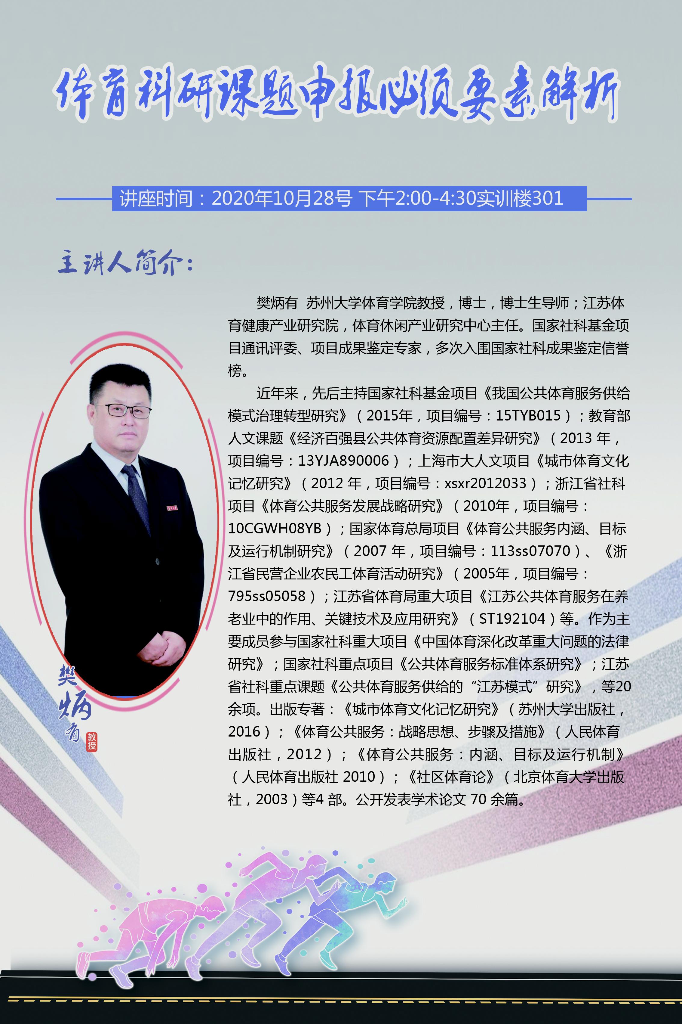 2020年10月28日下午,在实训楼301会议室开云kaiyun体育召开了以“体育科研课题申报必须要素解析”为主题的学术讲座。本次讲座邀请到苏州大学开云kaiyun体育博士生导师樊炳有教授,并由开云kaiyun体育副院长金梅教授主持,开云kaiyun体育全体教师及学生参加。