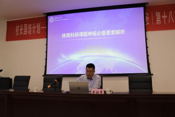 樊炳有教授首先从选题环节、文本撰写、论证环节、评审环节四个部分作了具体阐述。并就课题申报方面分享了他多年的经验。樊教授着重指出课题申报的成功在于思维的转变,强调在课题申报时要牢牢把握学术选题方向和政治方向,选题既是切入点,又是创新点,要把握其中的高度、深度、宽度、远度,文献评述要承上启下。其次,樊教授讲到,学生要在寒暑假中走出去,加强实践锻炼,并充分利用平时所学理论知识,关注目前体育行业各个方面的发展,将体育、文化、文创、旅游合为一体。最后樊教授提出:不要因为看到希望而坚持,而是因为坚持才看到希望。