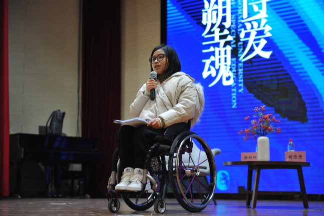 据悉,在东京残奥会力量举重女子50公斤级的比赛中,中国选手胡丹丹在开局重量落后对手11公斤的危险劣势下,凭借实力的发挥和正确的策略惊艳逆转,夺得了意义非凡的金牌。金牌的获得,是对胡丹丹数年来辛苦付出的认可,也是她对自己生命价值的实现。讲座中,一段视频,揭开了残奥冠军胡丹丹人生的神秘面纱。胡丹丹随后分享了自身的人生阅历,她指出从轮椅网球、到轮椅乒乓球再到举重,完成了人生一次次反转,而在每次反转过程中,面对的是无尽的挫折、困难。然而,胡丹丹敢于直面向前不畏惧,用勇于突破、敢于尝试、自强不息的精神挑战了人生的诸多不可能,用笑容和成绩完美诠释了生命的价值。