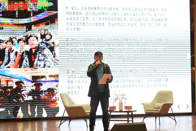 每块奖牌的获得,除了运动员本身的辛苦付出,离不开背后默默坚守的教练。《一支特殊的篮球队》视频的播放,将我们带进了徐老师指导篮球队训练的点点滴滴。随后,徐向阳老师作了“默默的坚守”的精彩主题分享,讲述了特教工作者的人格要求与专业要求,生动地再现了一位背后默默坚守,用爱心、细心、耐心和恒心,去照亮一个个特殊孩子未来的教练的日常。