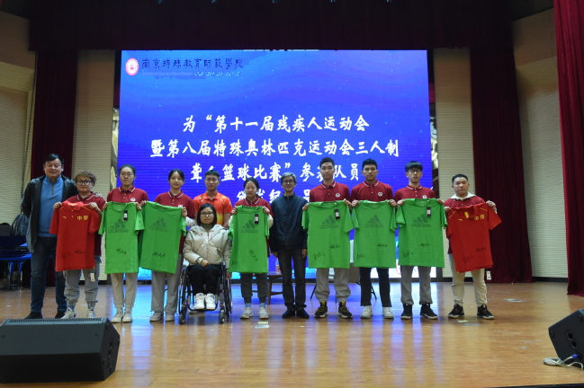 紧接着,谭忠副校长与残奥冠军胡丹丹为运动员们颁发纪念品,纪念品是一套球衣,上面留有姜佳音和胡丹丹的亲笔签名。