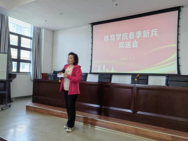 屈文文老师用“欣慰”和“不舍”两个关键词进行切入,号召更多的体育学子能够从学校走进军营,在不同的舞台上施展才华,在军营大熔炉里锻炼自己,也真诚地祝福入伍新兵一路顺风,早传捷报!