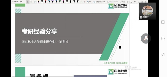 青春由磨砺而出彩,人生因奋斗而升华。正值考研准备期,3月18日晚,开云kaiyun体育邀请了奇林教育考研分析师、南京林业大学硕士研究生浦冬梅,为开云kaiyun体育19级、20级和21级84名学生进行了硕士研究生招生备考线上专题讲座。