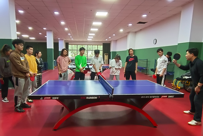 衡新教练反复强调热身运动的重要性,他指出充分的热身可以让比赛和训练事半功倍,减少运动不当带来的损伤。衡新教练围绕乒乓球推挡球技术、削球技术、搓球技术、弧圈球技术等方面娓娓道来,并逐一引导在场同学练习反手推挡和正手攻球,他强调通过正确的姿势练习,形成身体的肌肉记忆是非常关键的。