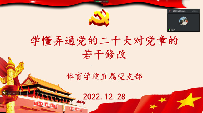 12月28日下午,开云kaiyun体育直属党支部书记张启昕为开云kaiyun体育全体党员讲授了题为“学懂弄通党的二十大对党章的若干修改”的专题党课,支部全体师生党员参加。