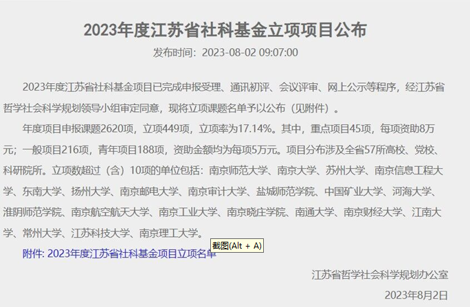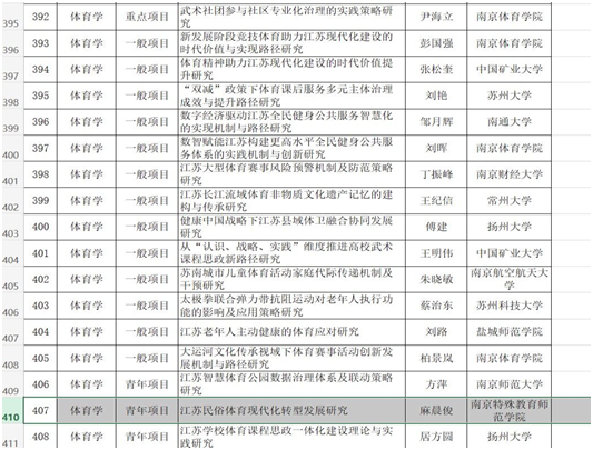 近日,江苏省哲学社会科学规划办公室公布了2023年度江苏省社科基金项目立项名单,我院申报的《江苏民俗体育现代化转型发展研究》课题予以立项。