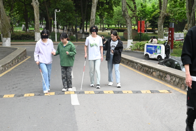 在“盲人走路体验”环节,南京警察学院学生会成员们蒙着眼罩、手拿盲杖,在我院学生的引导下绕学校一圈。这次体验让他们深刻感受到了盲人在日常生活中的艰辛和不易,他们不仅需要面对身体上的障碍,还要承受心理上的压力和孤独感,以此提升更多学生对残障人士的关注。