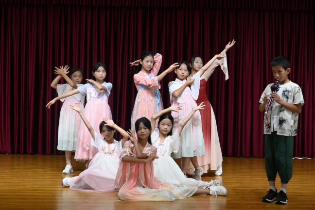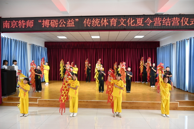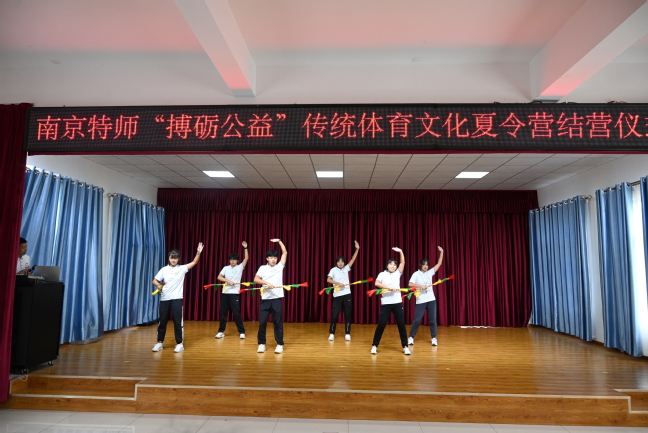 在结营仪式的课程成果汇报演出上,夏令营学员们表演自信而快乐,一个个精彩的演出迎来了阵阵掌声。《武术操》成果展示中,报告厅内响起了《男儿当自强励志旋律,放眼望去,只见60名学生排着整齐的方队,在志愿者口哨的指挥下,打出了团结,武出了精神;;传统体育《五步拳》由中年级学员完成,学员们动作舒展大方、快速有力、节奏分明、起伏多变、转折灵活;《三路长拳》由高年级学员代表完成,他们姿势舒展、动作灵活、节奏鲜明;歌曲《离别开出花》,孩子们天籁般清澈的歌声,表达了对本次夏令营活动的依依不舍剧目少年中国说》,唱出了当代少年的朝气蓬勃;才艺表演《荷塘月色》集舞蹈、葫芦丝与太极表演于一体,节奏轻快明朗,旋律清净动人。12天里,志愿者们拜师求学,用快乐的舞姿展示了当地非遗舞蹈——花棍舞,夏令营学员代表们随即展示了本次夏令营具有代表性的兴趣拓展项目:健身舞龙。