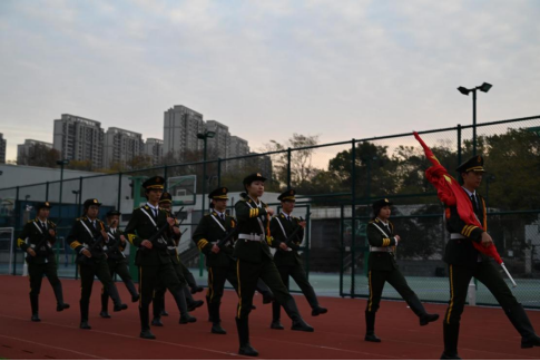 7点10分,主持人宣布升旗仪式正式开始。国旗护卫队成员们迈着整齐划一、钪锵有力的步伐,将国旗护送至升旗台前。国歌声响,红旗飘扬,现场师生面向国旗肃立,行注目礼,目光紧紧追随国旗的飘动,心中充满对伟大祖国的热爱和崇高敬意。