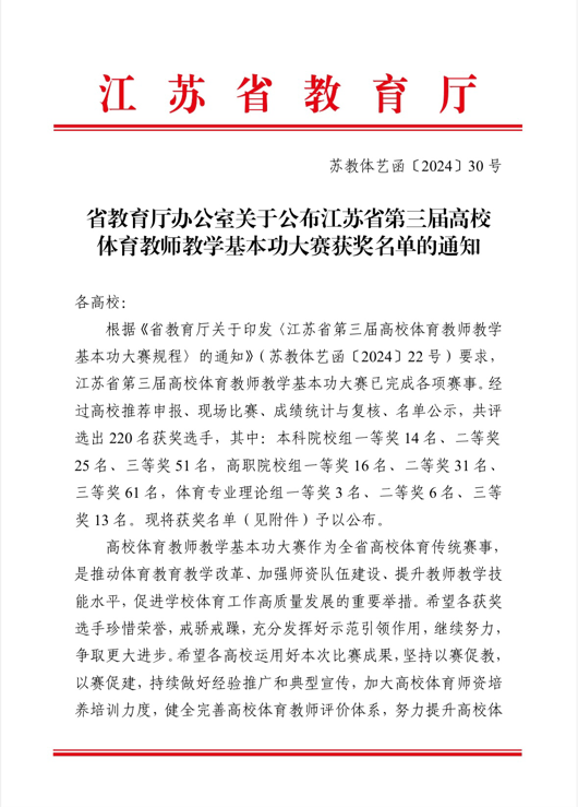 近日,省教育厅公布了江苏省第三届高校体育教师教学基本功大赛的获奖名单。在此次大赛中,开云两位教师李烨和夏博艳分别在足球和排球组、跆拳道和武术组别中获得二等奖,展现了高水平的教学技能和专业素养。