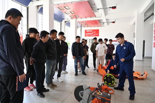随后,师生党员实地参观消防支队消防保障车辆、库房建设和物资储备情况。开展消防装备操作体验,实际体验灭火防护服、空气呼吸器等消防装备,了解掌握灭火器使用方法,并现场体验喷水实战化训练设施。