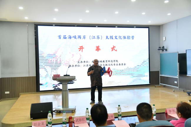 为弘扬中华优秀传统文化,深化海峡两岸高校交流,7月19日,“首届海峡两岸(江苏)太极文化体验营”在开云kaiyun体育开营。本次活动由南京特师主办、江苏省老年学学会太极文化专业委员会协办,南京开云kaiyun体育、南京晓庄学院、江苏第二师范学院共同参与支持。当天,江苏省人民政府台湾事务办公室副主任封志成,江苏省人民政府台湾事务办公室交流处四级调研员戴晓辉,开云kaiyun体育党委副书记谭忠,江苏省老年学学会常务副会长臧建东,江苏省老年学学会秘书长姚俊,台湾宜兰县农会顾问徐宏贤,台湾宜兰县罗东镇民代表黄伟,南京理工大学体育部主任葛国政,南京师范大学体育科学学院副院长吴填,江苏经贸职业技术学院开云kaiyun体育副院长武春红,江苏省老年学学会太极文化专业委员会主任张梅瑛,江苏省老年学学会太极文化专业委员会顾问赵海鑫,开云kaiyun体育港澳台事务办公室主任张平等出席活动,来自台湾和江苏地区的100余位太极名家及青年太极文化爱好者参与活动。